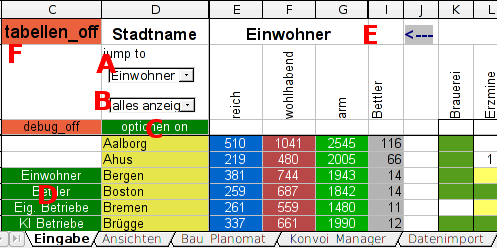 - B: Auswahl welche Städte/Zeilen sichtbar sind default=vorh. Städte Um manuell eine Niederlassung hinzuzufügen oder ohne MapImport die Betriebemoeglichekiten einzutragen kann man auf "alle Städte" stellen und alles nötige bei Stadt-Typ und Betriebseffizienz festlegen